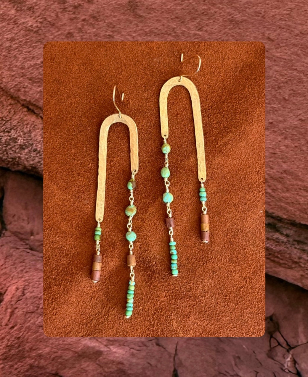 Forged & textured brass arches with Kingman turquoise, pipestone, and 14k gold fill earring hooks.