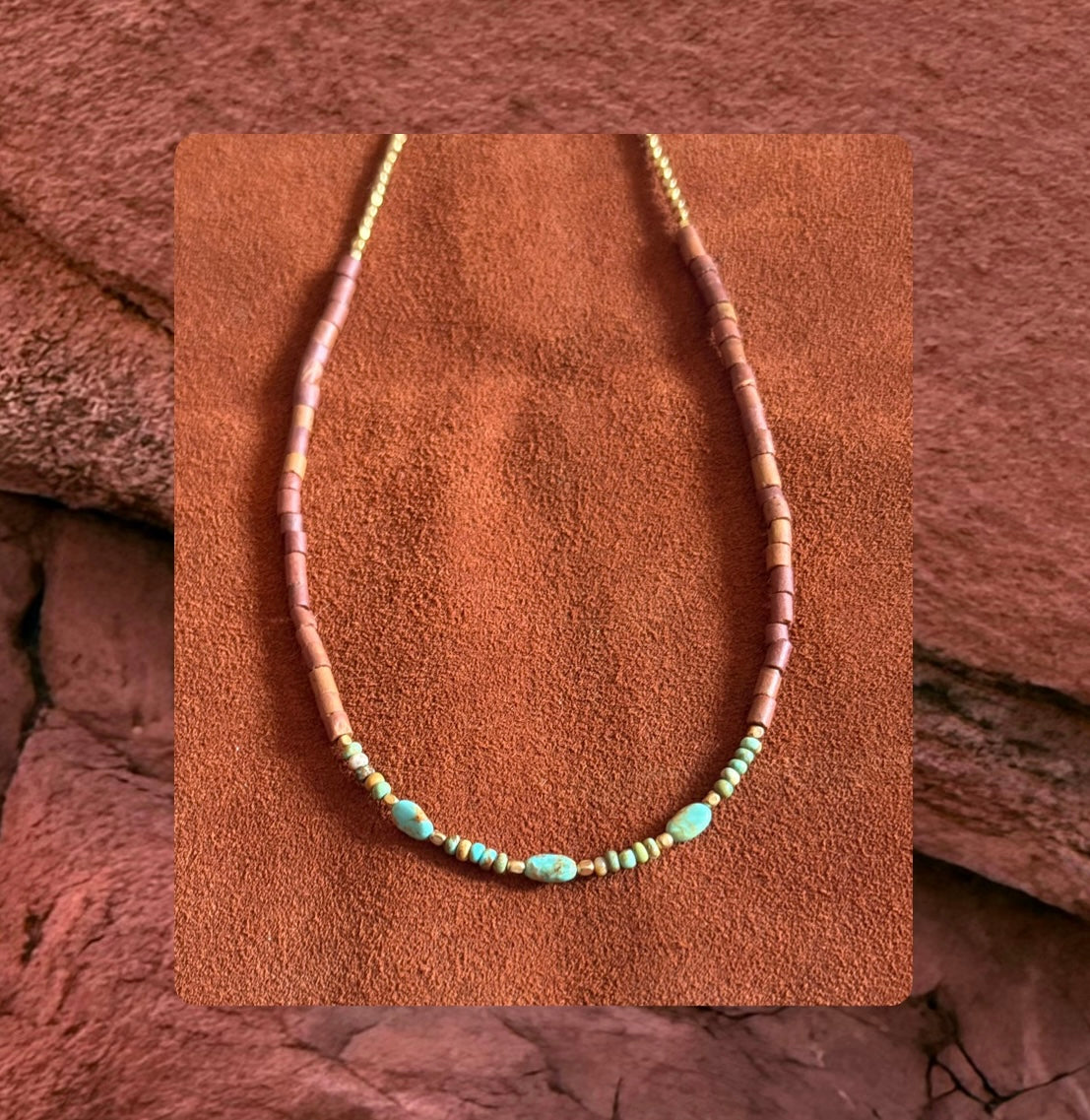 Kingman turquoise with varying hues, pipestone, & African fair trade brass beads on a bead wire with brass clasps.