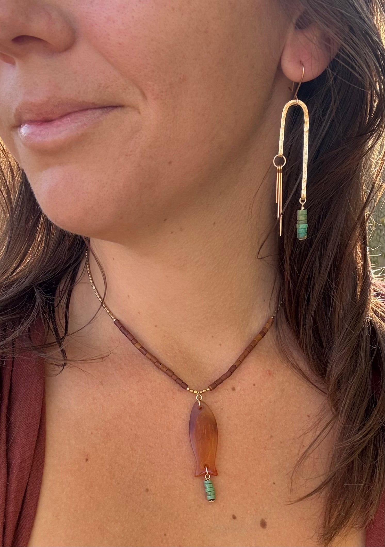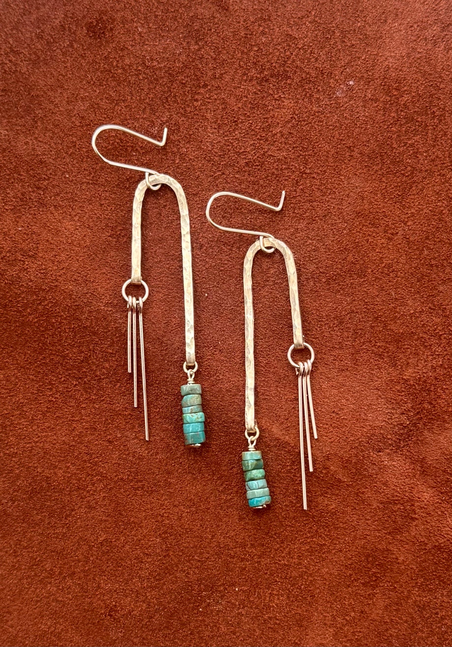 Forged & textured brass arches with turquoise & 14k gold fill earring hooks.